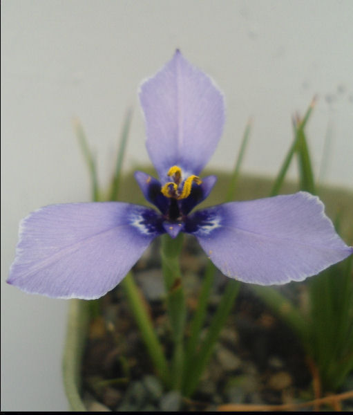 A special wee treasure – a small growing bulbous plant in the Iridaceae family, native to Chile. It makes fine linear leaves and beautiful Iris like flowers of lavender blue on 10cm stems. Requires a sunny well drained situation and is ideal to grow in a container Plants are growing in 9cm containers just coming into seasonal growth.