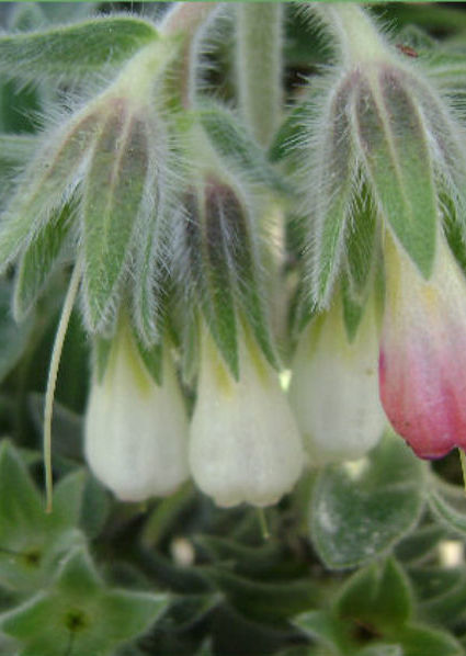A low growing perennial plant making rosettes of grey bristly foliage, and in spring and summer produces clusters of nodding bell shaped flowers, white flushed pink. requires a well drained sunny situation. Grows to around 30cm high and wide A special plant not often seen. These plants are growing in 9cm containers.