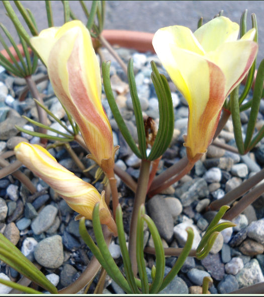 This species of collectable Oxalis has beautiful finger like foliage and lovely soft creamy lemon yellow blooms with a blush of red on the reverse of the petals, in the cooler months. Best grown in pots with free draining mix and kept dry during their dormancy in summer.