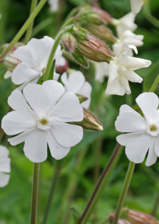 White Campion: A delightful plant for the perennial border making a compact basal clump of green foliage and stems of notched white flowers held in clusters on stems to around 40cms tall. A sunny well drained situation. A delightful cottage garden plant